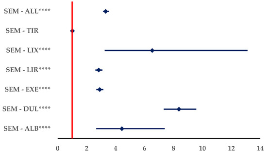 Disproportionality analysis for off-label use of SEM. ALB—albiglutide; DUL—dulaglutide; EXE—exenatide; LIR—liraglutide; LIX—lixisenatide; SEM—semaglutide; TIR—tirzepatide. **** p ≤ 0.0001.