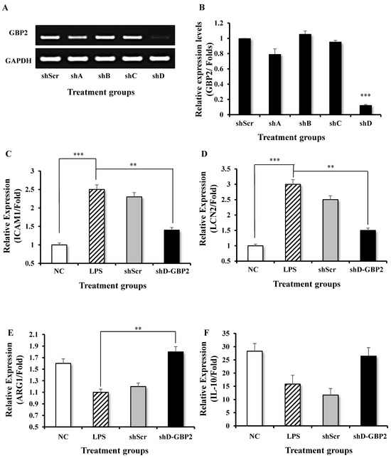 The expression of the decreased pro-inflammatory cytokines and the increased anti-inflammatory marker by GBP2 knock-down. The expression of pro-inflammation markers, such as IL-6, TNF-α and iNOS, analyzed at transcriptomic levels by RT-PCR (A–C) and at protein levels by ELISA (D–F). (G) The increased level of anti-inflammatory markers caused by shD-GBP2 treatment. Data are presented as means ± SD of three independent experiments. * p < 0.05, ** p < 0.02, or *** p < 0.01 for comparison of NC versus LPS group or LPS group versus shD-GBP2 group.