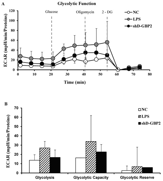 In previous experiments, we demonstrated that activated microglia induce an immune response leading to damage in neuronal cells. There are reports that the damage to nerve cells occurs due to changes in neuronal energy metabolism induced by cytokines released by M1 microglia [29,30]. As shown in Figure 6, we confirmed that GBP2 induces a decrease in immune cytokines, and we hypothesized that this would reduce the induction of changes in neuronal energy metabolism, thereby preventing neuronal cell death. For this, a glycolysis stress test (GST) was performed on the Seahorse XF analyzer to assess changes in the glycolytic flux in neurons (Figure 7). This assay measures net glycolysis-dependent proton production in cells. It is anticipated that the reserve biochemical capacity of the enzyme for glycolysis is exceeded, resulting in the depletion of NAD+ and, ultimately, the inhibition of the entire pathway. The extracellular acidification rate (ECAR) was monitored in SH-SY5Y neuronal cells after co-culture with BV2 microglial cells. These data showed a clear concentration-dependent decrease in the glycolytic flux (Figure 7A), consistent with the anticipated inhibition of the proton efflux into the media. The glycolysis and glycolytic capacity were significantly increased following co-cultures of the neurons with BV2 microglia activated by LPS, but not in the NC group or co-culture neuron with shD-GBP2 treated microglia (Figure 7B). In addition, the capacity of the cell to switch from oxidative phosphorylation to glycolysis following the injection of oligomycin, a specific inhibitor of ATP synthase, is suppressed in co-cultured neurons with shD-GBP2-treated microglia, indicating that GBP2 Kd induces a more energetic profile in neurons stimulated by activated microglia. These results indicate that activated microglia lead to neuronal cytotoxicity through mitochondrial dysfunction in neuronal cells.