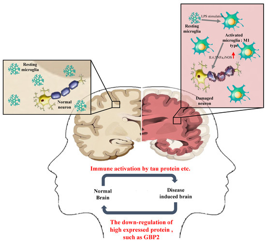 The ability to readily identify activated microglia has provoked considerable interest in their value, as indicators of pathology with possible diagnostic potential [19]. If we could characterize a unique gene expression signature of polarized microglia, it would be notable for both microglia biology and microglia-targeted therapies for various CNS diseases. Therefore, we analyzed a variety of the substances that were secreted from microglia that had been stimulated by foreign pathogens to perform their own functions according to the circumstances. Among them, we focused on the role of guanylate binding protein 2 (GBP2) as a candidate genetic material involved in the regulation of polarization, metabolic reprogramming, and inflammatory reactions that cause microglia to damage nerve cells [22,23]. Guanylate binding proteins (GBPs) are members of the 65–67 kDa GTPase family, and those induced by IFNs confer protectant functions against phylogenetically diverse pathogens and cooperate with core production and pyroptosis [24,25].