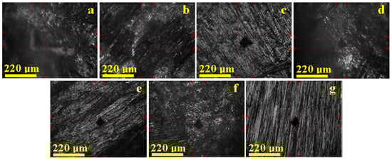 HV1 indentation imprints highlighted by the optical system of the hardness tester: (a) control sample—unground enamel, (b) burs, (c) 90 µm strips, (d) 60 µm strips, (e) 40 µm strips, (f) 15 µm strips, and (g) discs.