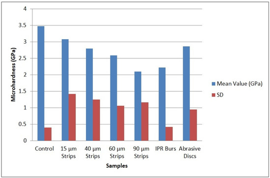 Regarding the remaining comparisons, no statistically significant differences (p > 0.05) were identified between the enamel microhardness values recorded in the control group and those obtained following the application of the various stripping instruments used in our study (Table 3). Thus, the null hypothesis with which this study commenced was accepted, implying that there is no correlation between the microhardness of dental enamel and different methods of interproximal enamel reduction.