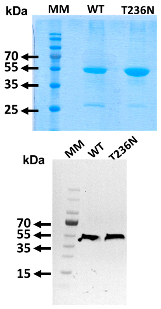 CBSWT and CBST236N mutant proteins were expressed using a bacterial expression system and purified to homogeneity as we have previously described [13]. To confirm the identity of the recombinant CBS proteins, SDS-PAGE analysis followed by Coomassie Brilliant Blue and Western blotting using an anti-CBS antibody was performed (Figure 1).