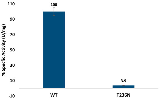 Activity was determined by measuring fluorescence emission at 460 nm (excitation at 368 nm) [12]. Our enzymatic assays demonstrated a drastic reduction in CBS activity upon introduction of the p.T236N mutation, consistent with its classification as a pyridoxine non-responsive mutation (Figure 2). This severe impairment in enzymatic function was similar to previous reports of other CBS mutations in the catalytic domain [10,23]. However, our study is the first to characterize and assess the CBST236N mutation activity. The observed reduction in enzymatic activity highlights the importance of pyridoxal and heme cofactors in modulating CBS function, further emphasizing the potential therapeutic implications of cofactor supplementation in certain CBS deficiency cases [24]. Our results showed similar impaired activity for other CBS missense mutations with prior investigations that evaluated enzymatic activity using diverse methodologies. For instance, comparable enzymatic profiles were noted in a prior analysis of 14 mutations within the human CBS gene aimed at assessing their potential pathogenicity. Of these mutations, eleven exhibited activity levels below 4% of the CBSWT protein, reinforcing the pathogenic nature of these mutations [25].