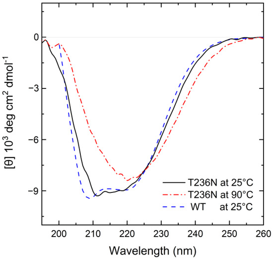 The far-UV spectrum of CBST236N at 25 °C revealed minor structural alterations associated with the p.T236N mutation at the same temperature (Figure 3). Analysis of the spectra using the BESTSEL online server [26] shows that the CBST236N mutant has a lower antiparallel (12.9%) and a higher parallel (14.3%) β-sheet content when compared to CBSWT (19.9% and 6.1%, respectively), indicating some differences in the overall protein architecture (Table 1). Heating CBST236N to 90 °C only partially unfolds the structure, with the protein retaining a significant portion of its secondary structure elements. However, this thermal transition is irreversible since no further changes in the far-UV CD spectrum were observed when the sample was cooled to 25 °C and visible protein aggregates formed in the cuvette as a direct result of the heating step.