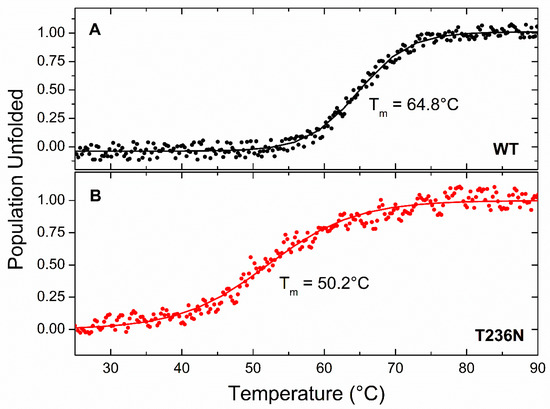The thermal stability of CBSWT and CBST236N was examined by heating the proteins at a steady rate from 25 °C to 90 °C and monitoring CD changes at 212 nm. The raw data were normalized as an unfolded protein population for comparison purposes, and the results are shown in Figure 4. Both the CBSWT and CBST236N proteins unfold following a simple two-state transition, as shown by the characteristic sigmoidal melting curves. The CBST236N unfolding process exhibits lower comparativity compared to that of CBSWT, as indicated by the temperature change required (ΔΤ) for a fully folded protein population to become unfolded (ΔTT236N ~ 40 °C and ΔTWT ~ 25 °C, respectively). Interestingly, CBST236N appears to be significantly thermally destabilized, as the melting temperature of the transition (Tm, temperature at which only 50% of the protein population is folded) is almost 15 °C lower than that of the CBSWT (TmT236N = 50.2 °C and TmWT = 64.8 °C, respectively). However, the non-reversibility of the transitions does not allow for a more detailed thermodynamic analysis of these data. Threonine’s hydroxyl group can participate in hydrogen bonding interactions, contributing to protein stability and folding [27]. Asparagine’s amide group can also engage in hydrogen bonding, albeit differently from the hydroxyl group. The substitution may affect the network of hydrogen bonds within the protein, influencing its stability and function.