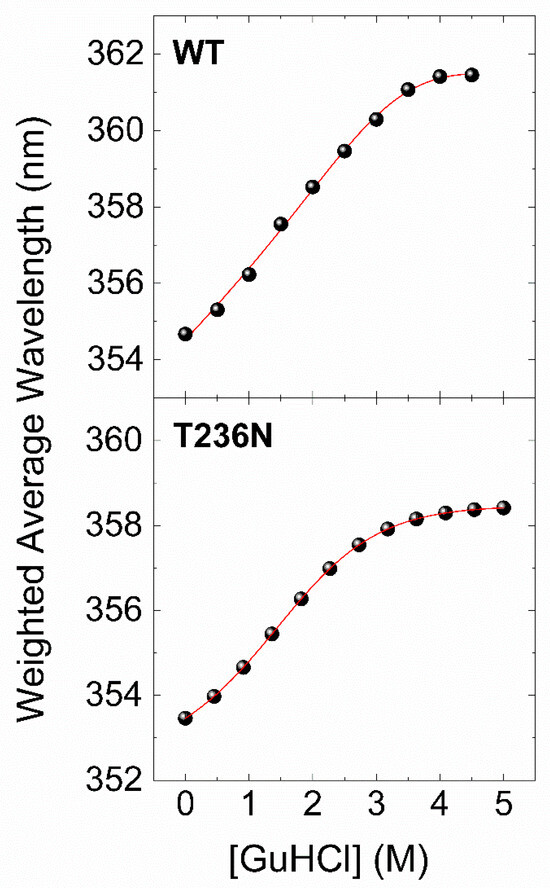 To further investigate the impact of p.T236N on protein stability, we used chemical denaturation assays to compare recombinant CBSWT and CBST236N proteins. This was achieved by monitoring changes in the fluorescence emission spectrum of the protein in the 300–450 nm range at different concentrations of a chemical denaturant. Guanidinium chloride (GuHCl) was used as a denaturant due to its ability to reversibly weaken or break noncovalent interactions, including salt bridges and hydrogen bonds [28]. The data of the chemical denaturation assays were processed as described in the Section 2, and the final results are presented in Figure 5 as plots of the weighted average emission wavelength versus GuHCl concentration. Similar to the thermal transitions of CBSWT and CBST236N, the chemical denaturation profiles show a two-state unfolding process for both proteins, with the fluorescence emission spectra shifting towards higher wavelengths as the concentration of the denaturant increases. However, in this case, the reversibility of the process (dialysis of the samples back to the original buffer conditions gives almost identical emission spectra) allows for a more in-depth thermodynamic analysis. Table 2 summarizes the thermodynamic stability parameters derived by a nonlinear least-squares curve fitting of a simple two-state transition model with our experimental data (Figure 4, solid lines). The results showed that the free-energy change difference (ΔΔGN-U) between CBSWT and CBST236N was 1.26 kcal/mol, indicating that the CBSWT protein is thermodynamically more stable than the CBST236N mutant. Taken together, CD and fluorescence data strongly suggest that CBST236N has a destabilizing effect on the CBS protein.