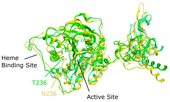 Overlayed representative MD structures for CBSWT (green ribbons) and CBST236N (yellow ribbons). Residues at position 236 are shown as ball–stick models, while the black lines show the location of the cofactor binding sites.