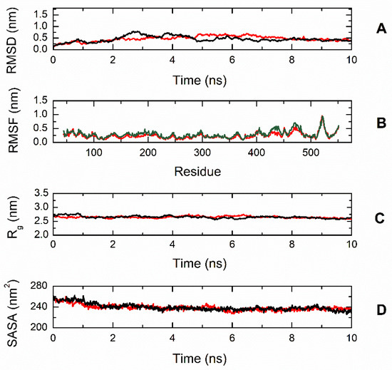 Trajectory analysis of CBSWT (black, ―) and CBST236N (red, ―) proteins. (A) Root-mean-square deviation (RMSD) of the protein backbone atoms as a function of MD simulation time. (B) Root-mean-square fluctuations (RMSFs) of individual residues for the duration of the simulation. (C) Total radius of gyration (Rg) of the protein backbone atoms as a function of MD simulation time. (D) Solvent-accessible surface area (SASA) of the protein as a function of MD simulation time. All parameters indicate a similar dynamic behavior for WT and mutant CBS.
