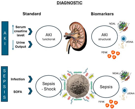 Current Diagnostic Approaches and Future Clinical Applications of Biomarkers in Sepsis and Acute Kidney Injury (AKI). Legend: The figure aims to exemplify the current diagnostic methods for both sepsis and acute kidney injury (AKI) and their potential future clinical application using biomarkers. The diagnosis of acute kidney injury (AKI) is based on the increase in serum creatinine and/or the decrease in urine output according to the KDIGO criteria. The main limitation of the current diagnosis lies in the progression of the disease to more severe stages, where functional injury is already present; biomarkers could diagnose structural damage before functional injury occurs. This early identification would allow for the implementation of targeted therapies, altering the natural course of the disease. On the other hand, the diagnosis of sepsis is based on suspicion or evidence of infection, coupled with organ dysfunction assessed by the SOFA scale with a score greater than two (Sepsis 3.0). The primary limitation of the current diagnosis is the progression of the disease to more severe stages, such as septic shock, where clinical severity can be fatal regardless of therapeutic interventions; thus, once again, biomarkers become useful in early detection and as a therapeutic target with better chances of recovery.