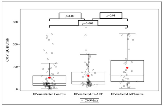 CMV IgG differed significantly across study groups (Figure 1, p = 0.003). Considering pairwise comparisons (using the Bonferroni adjustment for multiple comparisons), the mean CMV IgG among the ART-naïve group was significantly higher than both the on-cART group (p = 0.02) and the controls (p = 0.002). The mean CMV IgG did not differ significantly between the controls and on-cART groups (p = 1.0).