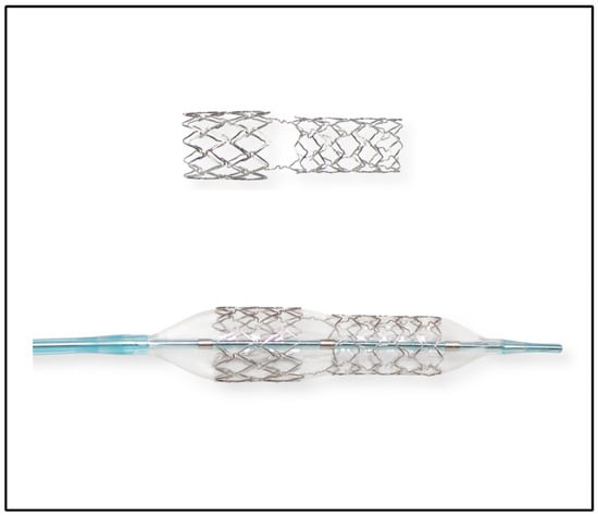 The BiOSS LIM C stent is a dedicated bifurcation stent crafted from a cobalt–chromium alloy with a strut thickness of 70 µm. It releases sirolimus (1.3 µg/mm2) from a biodegradable coating in a process lasting around 8 weeks. This stent comprises two distinct parts with varying diameters; it is wider proximally and smaller distally. The proximal segment is always shorter than the distal one (45% vs. 55%, respectively). The ratio of the diameters of the proximal part (ranging from 3.0 to 5.0 mm) and the distal part (ranging from 2.5 to 4.0 mm) varies between 1.15 and 1.3, ensuring physiological compatibility and optimal flow dynamics. A middle zone of 2.0 to 2.4 mm accommodates two connecting struts to facilitate an opening for the SB. BiOSS stents are available in three lengths: 16, 19, and 24 mm (Figure 1) [].