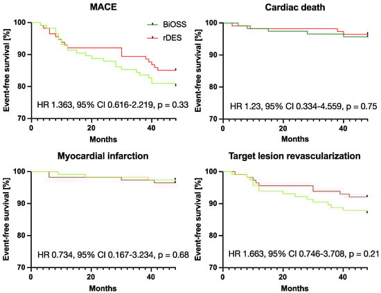 We obtained data from all patients in both groups. Detailed data on MACE, death, cardiac death, MI, and TLR rates are provided in Table 4 and Figure 3. At 48 months, there were no statistically significant differences between the BiOSS and rDES groups in terms of MACE, cardiac death, MI, or TLR. There were no stent thrombosis cases in any of the groups. In detail, the results were as follows for BiOSS vs. rDES: MACEs—18.1% vs. 14.9%, HR 1.36, 95% CI 0.62–2.22, and p = 0.33; cardiac death—4.3% vs. 3.5%, HR 1.23, 95% CI 0.33–4.56, and p = 0.75, MI (2.6% vs. 3.5%, HR 0.73, 95% CI 0.17–3.23, and p = 0.68; and TLR—11.2% vs. 7.9%, HR 1.66, 95% CI 0.75–3.71, and p = 0.21. All MACE cases were reported as serious adverse events.