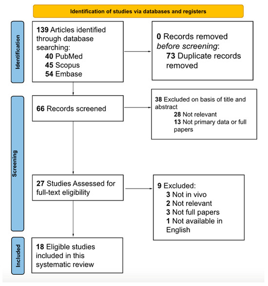 A total of 139 studies were extracted from the database search. After duplicates were deleted, 66 studies remained. A title and abstract screen then resulted in 27 remaining studies. While assessing for full-text eligibility, nine more studies were excluded. Ultimately, 18 eligible studies consisting of 800 total subjects were included in this systematic review (Figure 1). The majority of the studies (66.67%) were deemed to have an overall low risk of bias, while the rest of the studies (33.33%) were considered to have a medium risk of bias. The screening strategy and quality assessment are summarized inFigure 1 and Figure 2. Due to the considerable heterogeneity among the included studies in terms of sampling techniques, outcome measures, and study designs, it was deemed not feasible to conduct a pooled meta-analysis without compromising the validity of the results.