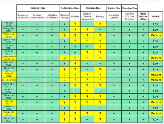 Quality assessment of included studies using SYRCLE risk of bias tool. Green boxes indicate no concerns; yellow boxes indicate some concerns [9,22,23,24,30,31,32,33,34,35,36,37,38,39,40,41,42,43].