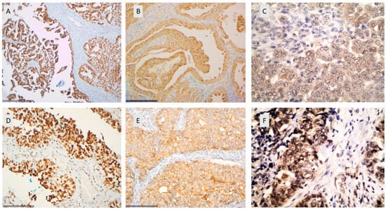 Immunohistochemical expression of HDAC-2 (A,D), HDAC-4 (B,E), and HDAC-5 (C,F) in epithelial ovarian carcinomas. (A) A high-grade serous ovarian carcinoma with nuclear HDAC-2 expression (×200). (B) A high-grade serous ovarian carcinoma with cytoplasmic HDAC-4 expression (×200). (C) A high-grade serous ovarian carcinoma with cytoplasmic HDAC-5 expression (×400). (D) A high-grade serous ovarian carcinoma with nuclear HDAC-2 expression (×400). (E) A high-grade serous ovarian carcinoma with cytoplasmic HDAC-4 expression (×400). (F) A high-grade serous ovarian carcinoma with nuclear and cytoplasmic HDAC-4 expression (×400).