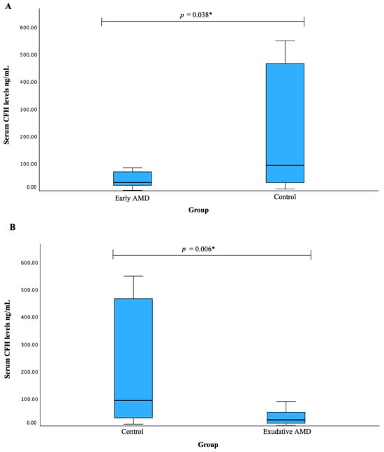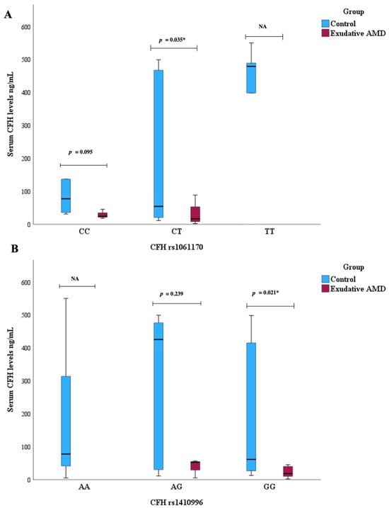3.6. Serum CFH Levels and CFH SNPs Associations with AMD