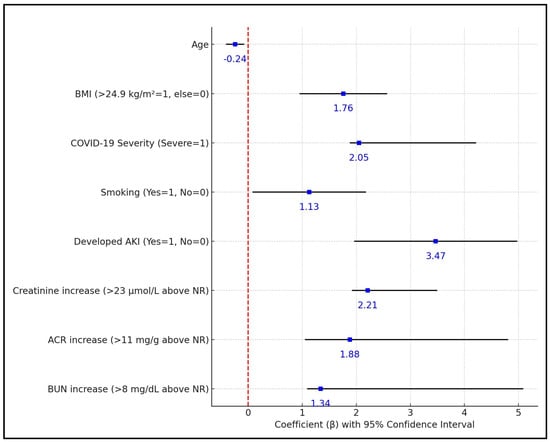 AKI was a strong predictor of eGFR decline, with a β of 3.47 (p < 0.001) and a CI of 1.97 to 4.97, clearly demonstrating that patients who developed AKI during their initial COVID-19 illness had a significantly higher risk of sustained reduction in kidney function. An increase in creatinine levels of more than 23 μmol/L above the normal range was also a significant predictor of eGFR decline, with a β of 2.21 (p < 0.001) and a CI of 1.93 to 3.49, highlighting the impact of kidney injury marked by elevated creatinine on long-term kidney function. Increases in the ACR greater than 11 mg/g above the normal range and BUN increases greater than 8 mg/dL above the normal range were also significantly associated with decreased eGFR, with β coefficients of 1.88 (p < 0.001, CI: 1.06 to 4.80) and 1.34 (p = 0.001, CI: 1.10 to 5.08), respectively (Table 7, Figure 1).