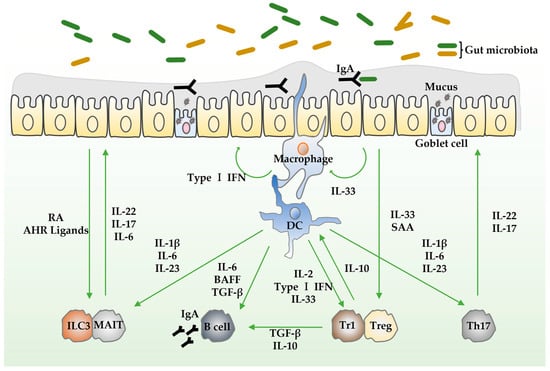 The intestinal epithelium is coated by secreted immunoglobulin (Ig) A to prevent pathogenic bacteria from interacting directly with the intestinal epithelium []. B cell activating factor (BAFF), IL-10, IL-6, and transforming growth factor (TGF)-β promote IgA secretion from plasma cells [,].