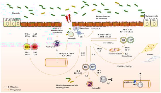 In UC, lymphocyte antigen 6 complex (Ly6C)high monocytes are increased at inflammatory sites. Their migration is regulated by the C-C motif chemokine receptor (CCR)2, IL-8 and TGF-β, which are constitutively produced by IECs [,,]. Ly6Chigh monocytes are highly susceptible to bacteria due to elevated expression of Toll-like receptor (TLR)2 and nod-like receptor (NOD)2 []. Additionally, C-X3-C motif chemokine receptor (CX3CR)int macrophages with upregulated TLR2 also accumulate at inflammatory sites in UC [,]. These macrophages have an increased ability to secrete inflammatory cytokines such as TNF-α, IL-1β, and IL-6 []. Abnormally activated macrophages promote myofibroblast-mediated fibrosis by producing TGF-β1, connective tissue growth factor (CTGF), and fibroblast activating protein (FAP) [].