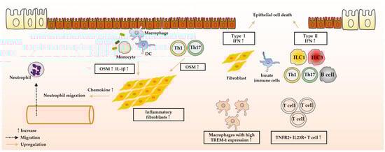 Type I IFNs, secreted by various cells, including DCs and fibroblasts, play an anti-inflammatory role by promoting epithelial repair and Treg cell differentiation. However, they also play a pro-inflammatory role by inducing IFN-stimulated gene, which has potent antimicrobial activity, and by promoting the production of inflammatory cytokines [,]. Type II IFNs, secreted by various cells including Th1 cells, ILC1, B cells, macrophages, and epithelial cells, provide broad protection against intracellular microbes []. Excess type II IFN exacerbates inflammation by activating macrophages, augmenting antigen processing, and inducing epithelial cell death [].