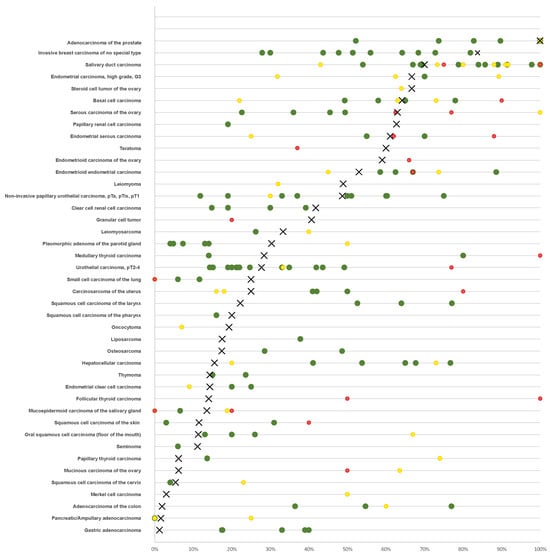 Most of the importance of AR comes from its well-proven role as a highly suited therapeutic target for adenocarcinomas of the prostate []. Given the frequent and often high-level AR expression in many other tumor types, it is obvious to consider AR targeting therapies for these tumors. The successful use of anti-androgen drugs has been reported in various cancer types including carcinomas of the breast [], salivary gland carcinoma [,], ovarian cancer [], bladder cancer [], and salivary duct carcinoma [,,]. Clinical trials on the use of anti-androgen drugs in non-prostate cancers are currently underway (according to clinicaltrials.gov, accessed on 28 December 2023) in breast carcinoma (especially triple negative breast cancer) (n = 12), salivary gland carcinoma (n = 6), or bladder cancer (n = 2). Once a more widespread clinical utility of these drugs should become evident, our ranking order of tumors according to their AR positivity rates would define the tumor entities that can benefit most from such approaches and which would be best suited for further clinical trials.