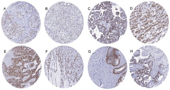 - Uhlen, M.; Bjorling, E.; Agaton, C.; Szigyarto, C.A.; Amini, B.; Andersen, E.; Andersson, A.C.; Angelidou, P.; Asplund, A.; Asplund, C.; et al. A human protein atlas for normal and cancer tissues based on antibody proteomics. Mol. Cell. Proteom. 2005, 4, 1920–1932. [Google Scholar] [CrossRef]