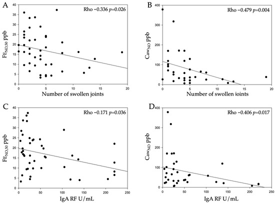 Correlation plots for FENO,50 and CawNO for the number of swollen joints (A,B), and for IgA RF (C,D).
