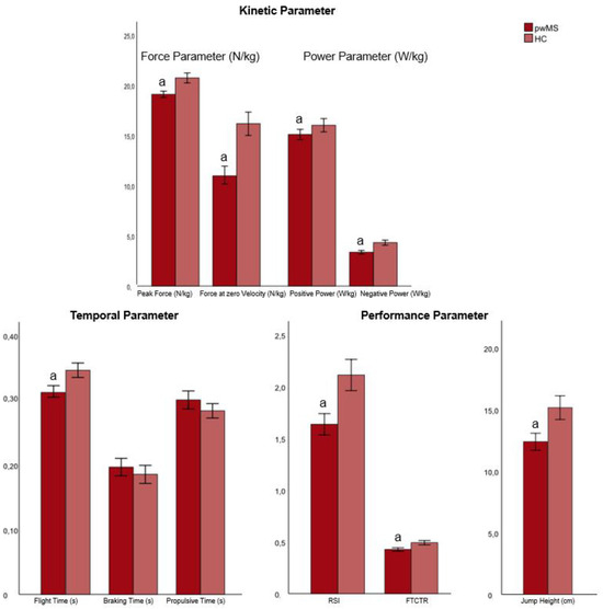 Figure 2. Contrast (post hoc) tests for group (pwMS and HC) on the jumping parameters (means ± SD) (model 1). Abbreviations: a = significant difference with HC (p < 0.05); RSI = reactive strength index; FTCTR = flight time–contraction time ratio; RSI and FTCTR have an arbitrary unit.
