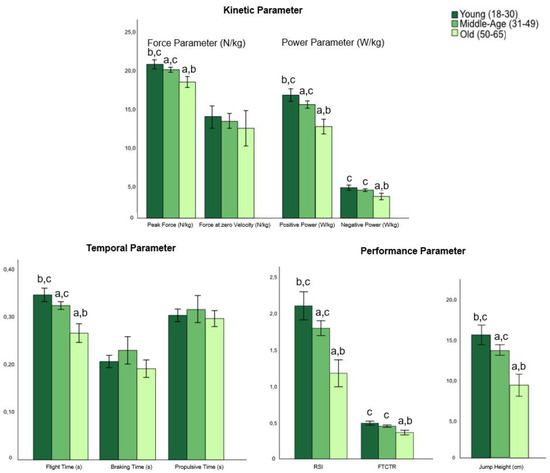 Figure 3. Contrast (post hoc) tests for age (young, middle-age, old) on the jumping parameters (means ± SD) for all participants (both MS and HC) (model 1). Abbreviations: a = significant difference to young (p < 0.05); b = significant difference to middle-age (p < 0.05); c = significant difference to old (p < 0.05); RSI = reactive strength index; FTCTR = flight time–contraction time ratio, RSI and FTCTR have an arbitrary unit.