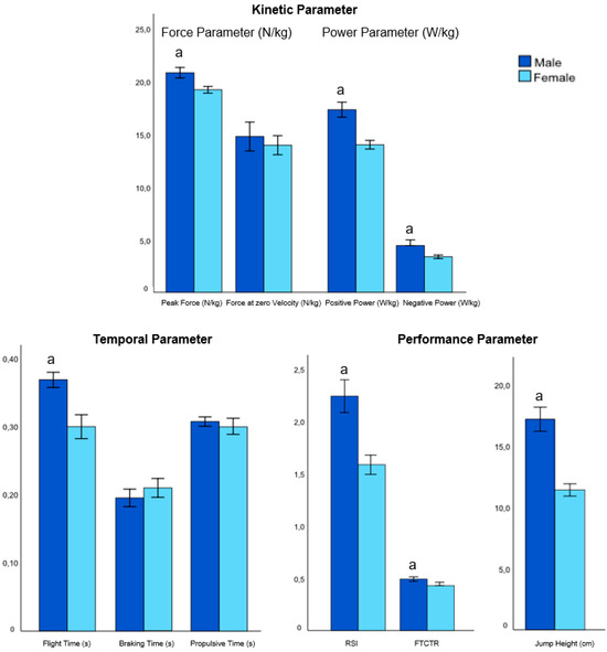Figure 4. Contrast (post hoc) tests for sex (male, female) on the jumping parameters (means ± SD) for all participants (both MS and HC) (model 1). Abbreviation: a = significant difference with female (p < 0.05); RSI = reactive strength index; FTCTR = flight time–contraction time ratio, RSI and FTCTR have an arbitrary unit.