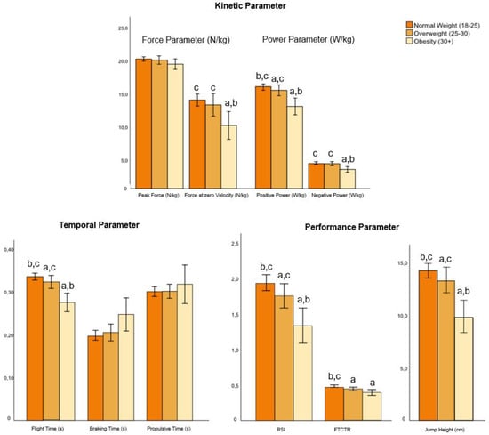 Figure 5. Contrast (post hoc) tests for BMI (normal weight, overweight, obesity) on the jumping parameters (means ± SD) for all participants (both MS and HC) (model 1). Abbreviations: a = significant difference to normal weight (p < 0.05); b = significant difference to overweight (p < 0.05). c = significant difference to obesity (p < 0.05); RSI = reactive strength index; FTCTR = flight time–contraction time ratio; RSI and FTCTR have an arbitrary unit.