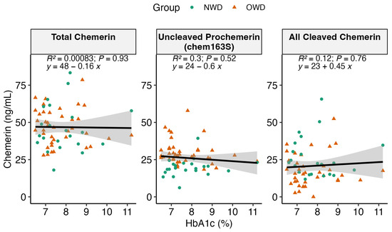 We analyzed whether there was any correlation between the levels of each chemerin form (including total, intact chem163, and cleaved) in the plasma samples and HbA1c (%) in the individuals categorized as NWD and OWD. Across the range of HbA1c (%), we observed no correlation between the HbA1c (%) levels and the chemerin levels in OWD and NWD, suggesting that glucose homeostasis is not related to chemerin levels in these individuals with T2D (p > 0.05 for all, Figure 2).