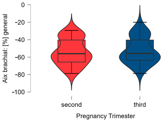 The data distribution of AIx brachial values in the second (T0) and third trimester of pregnancy (T1) (n = 40), using a boxplot representation with violin effect.