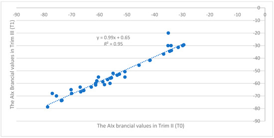 The association between the AIx brachial values in Trim II (T0) and Trim III (T1) (n = 40).