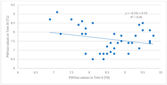 The association between the PWVao values in Trim II (T0) and Trim III (T1) (n = 40).