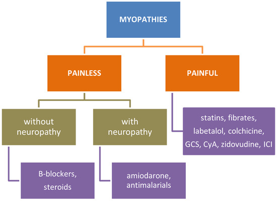 Clinical and histological features of main drug-related myopathies are summarized in Figure 2, Figure 3 and Figure 4.
