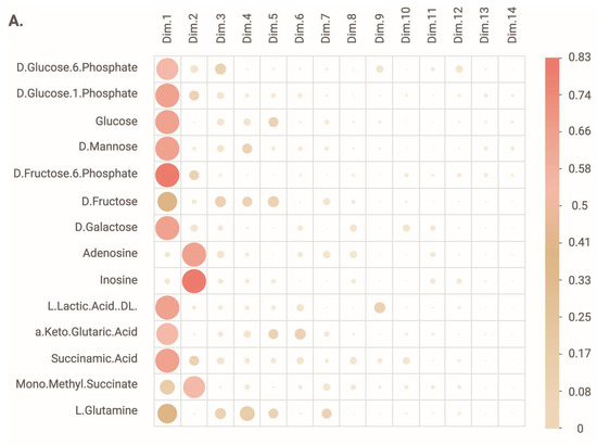 The metabolic profile of LCLs successfully derived from ASD-Phen1 patients (N = 17) was characterized and compared to the metabolic profile of LCLs successfully derived from ASD-non-Phen1 (N = 19) and TD individuals (N = 20) (Supplementary Table S1). Using the PM-M1 assay of the Biolog PM-M platform, we assessed the ability of the LCLs to utilize the various carbon-based energy sources. The overall analysis of the metabolic profile was carried out through a principal component analysis, which revealed that the compounds accounting for the most variance observed in dimension 1 (Dim.1) were D-glucose-6-phosphate (DG6P), D-glucose-1-phosphate (DG1P), D-glucose, D-mannose, D-fructose-6-phosphate (D6FP), D-fructose, D-galactose, lactic acid, alpha keto glutaric acid, succinamic acid and, to a lower extent, mono-methyl succinate and L-glutamine (Figure 1A). The compounds accounting for the most variance observed in dimension 2 (Dim.2) were adenosine, inosine, and mono-methyl succinate (Figure 1A).