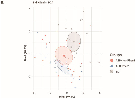 PCA analysis of absorbance measures at 24 h. (A) Correlation plot showing the contribution of each compound to the variance in dimension 1 and 2 (dim.1 and dim.2). Note that the bigger and darker the dot, the higher the contribution of the compound to the variance. (B) Biplot representation of the dim.1 and dim.2 with individual data points for each lymphoblastoid cell line (LCL), as well as the average ± s.d for each cohort. N = 20 LCLs from typically developing individuals (TD), N = 19 LCLs from ASD-non-Phen1 and N = 17 LCLs from ASD-Phen1.