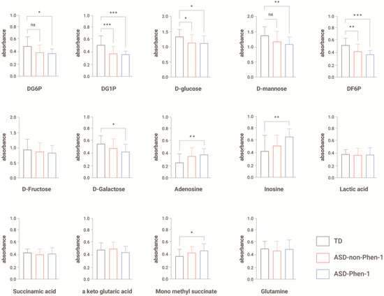 Absorbance measure after 24 h after exposure to each metabolite. Data are represented as average + s.d. One-way ANOVA followed by Tukey’s multiple comparisons. * p < 0.05, ** p < 0.01 and *** p < 0.001. N = 20 LCLs from typically developing individuals (TD), N = 19 LCLs from ASD-non-Phen1, and N = 17 LCLs from ASD-Phen1. ns: non-significant.