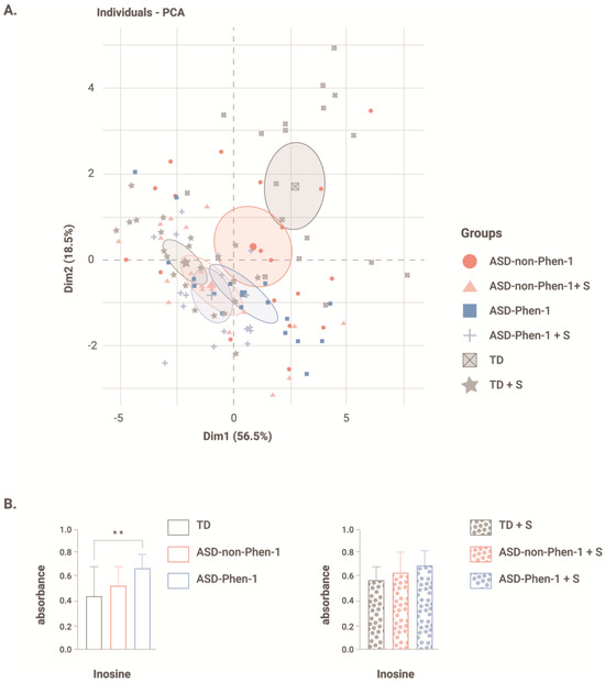 Effect of treatment with sulforaphane on PCA and absorbance after exposure to inosine. (A) Biplot representation of dimension 1 and dimension 2 with individual data points for each lymphoblastoid cell line (LCL) without treatment or treated with sulforaphane (+S), as well as the average ± s.d. for each cohort. N = 20 LCLs from typically developing (TD) individuals without and with pretreatment with sulforaphane (TD + S), N = 19 LCLs from ASD-non-Phen1 without and with pretreatment with sulforaphane (ASD-non-Phen1 + S), and N = 17 LCLs from ASD-Phen1 without and with pretreatment with sulforaphane (ASD-Phen1 + S). (B) Absorbance measured 24 h after exposure to inosine in LCLs from ASD-Phen1, ASD-non-Phen1 and TDs without treatment or treated with sulforaphane (+S). Data are represented as average + s.d. One-way ANOVA followed by Tukey’s multiple comparisons. ** p < 0.01. N = 20 LCLs from typically developing individuals (TD), N = 19 LCLs from ASD-non-Phen1 and N = 17 LCLs from ASD-Phen1.
