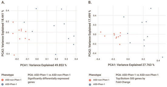 PCA of gene expression profiles from ASD-Phen-1 and ASD-non-Phen-1 patients using (A) statistically significantly differentially expressed genes and (B) top 250 up- and down-regulated genes (sorting by Log2(FC)) in ASD-Phen1 compared to ASD-non-Phen1.