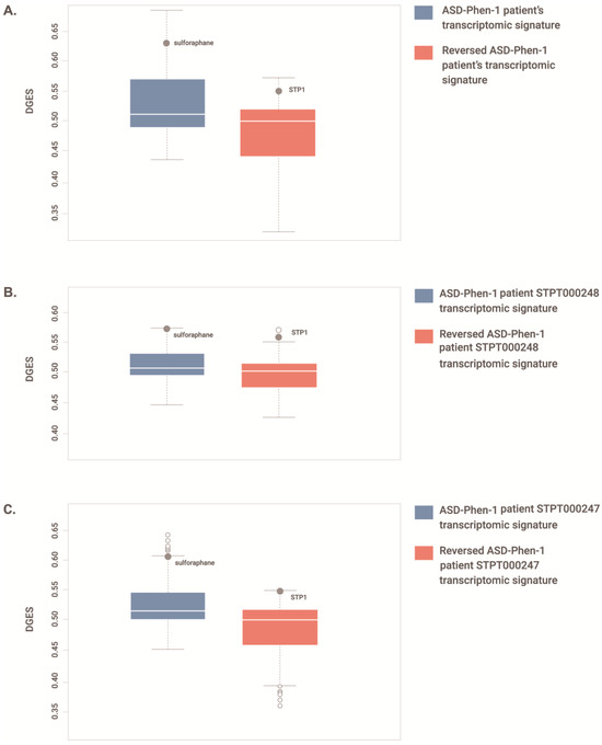 Distribution of transcriptional similarity (DGES) scores between drug and ASD-Phen1 gene expression profiles. DGES scores comparing a total of 2100 drug-elicited gene expression profiles. Boxplots show the first quartile (Q1/25th percentile): the middle number between the smallest number and the median of the dataset; the median (Q2/50th percentile): the middle value of the dataset; third quartile (Q3/75th percentile): the middle value between the median and the highest value of the dataset; interquartile range (IQR): 25th to the 75th percentile; maximum: Q3 + 1.5 × IQR; minimum: Q1 − 1.5 × IQR; outliers (open circles); position of the drug treatment (full circle). (A) the observed ASD-Phen1 vs. ASD-non-Phen1 disease transcriptomic signature (highlighting the position of sulforaphane) and the reversed ASD-Phen1 vs. ASD-non-Phen1 disease transcriptomic signature (highlighting the position of STP1); (B) the observed ASD-Phen1 STPT000248 vs. commercial LCL disease transcriptomic signature (highlighting the position of sulforaphane) and the reversed ASD-Phen1 patient STPT000248 vs. commercial LCL disease transcriptomic signature (highlighting the position of STP1); (C) the observed ASD-Phen1 patient STPT000247 vs. commercial LCL disease transcriptomic signature (highlighting the position of sulforaphane) and the reversed ASD-Phen1 patient STPT000247 vs. commercial LCL disease transcriptomic signature (highlighting the position of STP1).