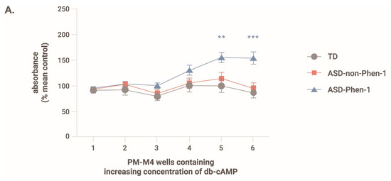 One of the components of STP1—predicted by DEPI as a tailored-treatment candidate for the ASD-Phen1 subgroup—is an inhibitor of the cyclic nucleotide phosphodiesterase form 4 and form 3 (ibudilast), which leads to the accumulation of cAMP. In this context, we also assessed the effect of cAMP on the ability of the LCLs to metabolize glucose. The PM-M6 assay comprises, among others, six wells containing no compound and six wells with increasing concentrations of dibutyryl-cAMP (db-cAMP, a cell membrane-permeant analog of cAMP). Figure 6A shows the effect of increasing concentrations of db-cAMP on the NADH production by LCLs from ASD-Phen1, ASD-non-Phen1, and TD individuals. Whereas increased concentration of db-cAMP increases the production of NADH with a maximum reached for the two highest doses, increased concentrations of db-cAMP have no effect on LCL NADH production from ASD-non-Phen1 and TDs. Upon pre-treatment of LCLs from ASD-non-Phen1 and TDs with sulforaphane, increasing concentration of db-cAMP enhanced the NADH production, similarly to what is observed in untreated ASD-Phen1 LCLs. Interestingly, in LCLs from ASD-non-Phen1 and TDs pretreated with sulforaphane, increasing db-cAMP concentration induced a dose-related increase in the NADH production similar to what was observed in ASD-Phen1 LCLs (Figure 6B). These results indicate that upregulation of NRF2 in ASD-non-Phen1 and TDs mimics the specific cAMP sensitivity observed in LCLs from ASD-Phen1. Importantly, in LCLs from ASD-Phen1, pretreatment with ibudilast (the STP1’s PDE4/3 inhibitor component) showed a similar effect as compared to db-cAMP on the levels of produced NADH in the presence of glucose (Figure 6C).