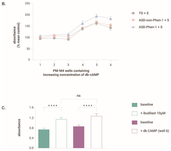 Absorbance measured 24 h after exposure to glucose and increasing concentrations of db-cAMP with/without sulforaphane. (A) absorbance in untreated LCLs, (B) absorbance in LCLs pretreated with sulforaphane. For each LCL, the absorbance value was normalized to that measured in the absence of db-cAMP. Data are presented as the average + s.d. One-way ANOVA followed by Tukey’s multiple comparisons. ** p < 0.01, *** p < 0.001. N = 20 LCLs from typically developing individuals without (TD) and with pretreatment with sulforaphane (TD + S), N = 19 LCLs from ASD-non-Phen1 without (ASD-non-Phen1) and with pretreatment with sulforaphane (ASD-non-Phen1 + S), and N = 17 LCLs from ASD-Phen1 without (ASD-Phen1) and with pretreatment with sulforaphane (ASD-Phen1 + S). (C) Absorbance value measured in LCL from ASD-Phen1 (N = 17) under baseline condition (i.e., without any metabolite effector) and in the presence of ibudilast (+ibudilast, 10 µM) or db-cAMP (well 6). **** p < 0.0001, ns: non-significant, one-way ANOVA.