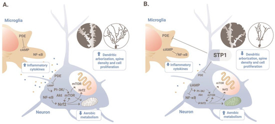 MoA of STP1 in ASD-Phen1. (A) Chronic increased inflammatory responses lead to a constitutively active NF-κB, and in turn, NRF2, in patients with ASD-Phen1; this results in an increased dendritic arborization, spine density, and cellular proliferation, as well as a decrease in the aerobic metabolism (also known as the Warburg effect). (B) By inhibiting PDE4/3 and, therefore, increasing cellular levels of cAMP, STP1 can inhibit NF-κB and decrease the activity of NRF2 to re-establish homeostatic cellular growth and metabolism.