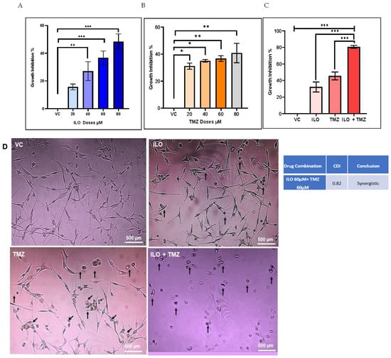 The graphical illustrations of the effects of ILO (A), TMZ (B), and their combination (C) on U-87 MG growth. The cells were treated with different doses of ILO and TMZ (20 µM, 40 µM, 60 µM, and 80 µM) for 48 h, followed by an MTT assay. Bar graph illustrating dose-dependent growth inhibition of U-87 MG cells with ILO and dose-independent growth inhibition of U-87 MG cells with TMZ. Combination of ILO and TMZ synergistically (CDI < 1) inhibits the growth of U-87 MG cells at a dose of 60 µM. Each bar represents mean ± S.E.M of 3 independent experiments performed. Significant difference is represented by *, where * indicates p < 0.05, ** represent p < 0.01 and *** indicates p < 0.001. (D) Photomicrographs (10×) representing 48 h treatment effects of VC, ILO 60 µM, TMZ 60 µM, and their combination on the morphology of U-87 MG cells via phase contrast microscopy. Obvious changes in cellular morphology are observed where cells start to lose their connections, shrink, and become rounded. Arrowheads indicate changes in the cell.