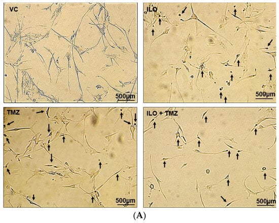 Different concentrations of ILO and TMZ (20 µM, 40 µM, 60 µM, and 80 µM) were used for the treatment. Multiple combination doses of ILO and TMZ were tried and tested in order to select the most effective combination dose at which cell growth inhibition was synergistic. The doses were selected considering previous studies where IC50 of 80 µM was reported for ILO; a range of 10 µM to 100 µM was used for TMZ [,,,]. ILO and TMZ were dissolved in 100% sterile DMSO at a stock concentration of 50 mM and carefully stored at −20 °C until further use. A working solution of the drugs and compounds was freshly prepared by diluting a stock solution in the culture medium. The final concentration of DMSO did not exceed 0.1% (v/v) in the culture medium. DMSO was used as a vehicle control (VC). Before each experiment, ILO and TMZ were diluted from the stock solution to the final concentration with DMEM. All experiments were conducted in triplicate and repeated independently at least 3 times.