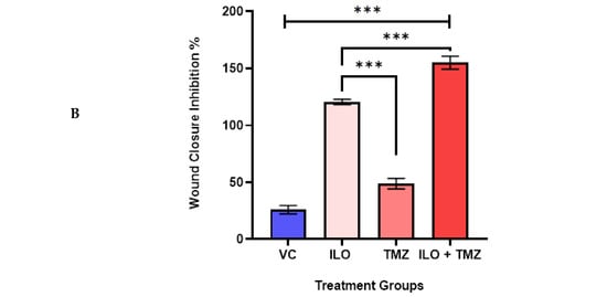 ILO photomicrographs (A) and graphical illustration (B) showing the effect of treatment of ILO, TMZ, and their combination on cell migration: photomicrographs (10×) showing inhibition of migration of U-87MG cells after 48 h of treatment with ILO 60 µM, TMZ 60 µM, and the combination. A wider scratch area can be seen in the treated group compared to the control. Bar graph showing % wound closure inhibition. Each bar represents mean ± S.E.M of 3 independent experiments. A significant difference was observed in wound closure inhibition % in treated groups as compared to VC, with a more pronounced effect in the combination treatment group. Significant difference is represented by *** which indicates p < 0.0001.