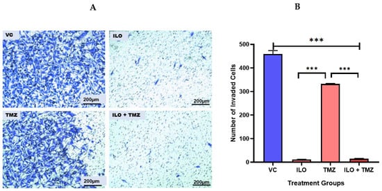A Transwell Invasion Assay was performed to observe the invasive potential of U-87 MG after a 48 h treatment with ILO, TMZ, and their combination. After treatment, an invasion assay was performed. ImageJ software was used to quantify the invaded cells. Photomicrographs were taken at 10× magnification. Results revealed that all treatment groups significantly (p < 0.001) inhibited GBM cell invasion as compared to the control (p < 0.001). Further, the number of invasive cells was minimal (p < 0.001) in the ILO and combination treatment groups (Figure 4A,B).